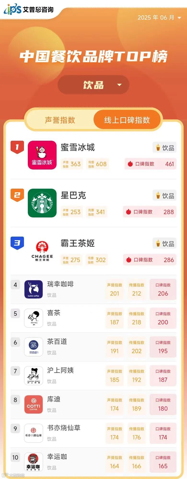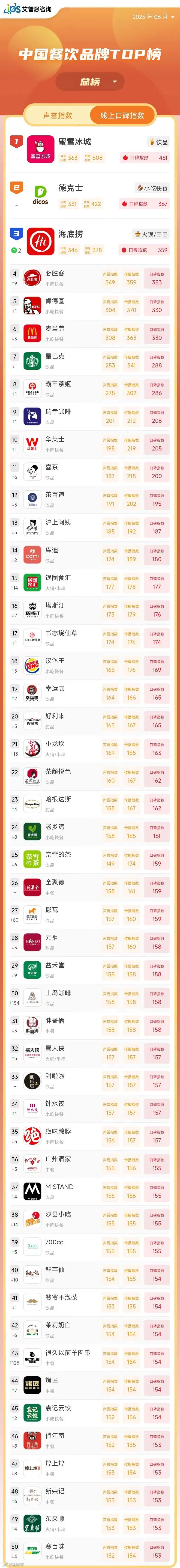 从子指数的表现来看,6月传播指数、声誉指数最高的餐饮品牌均为蜜雪冰城(传播指数608,声誉指数363)。