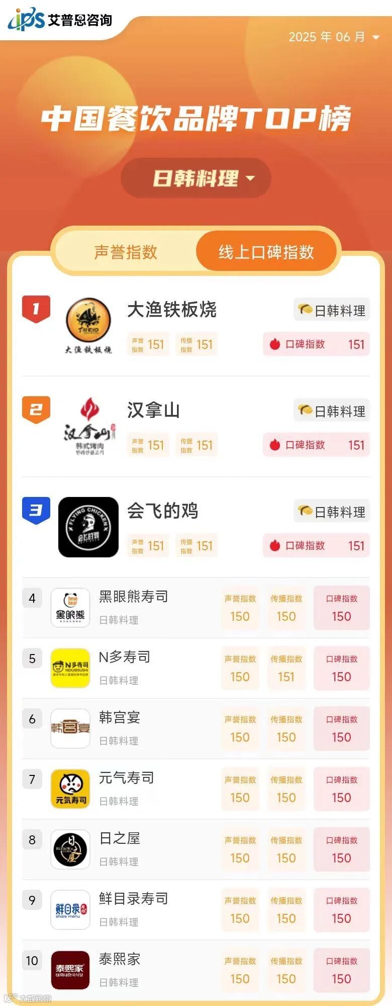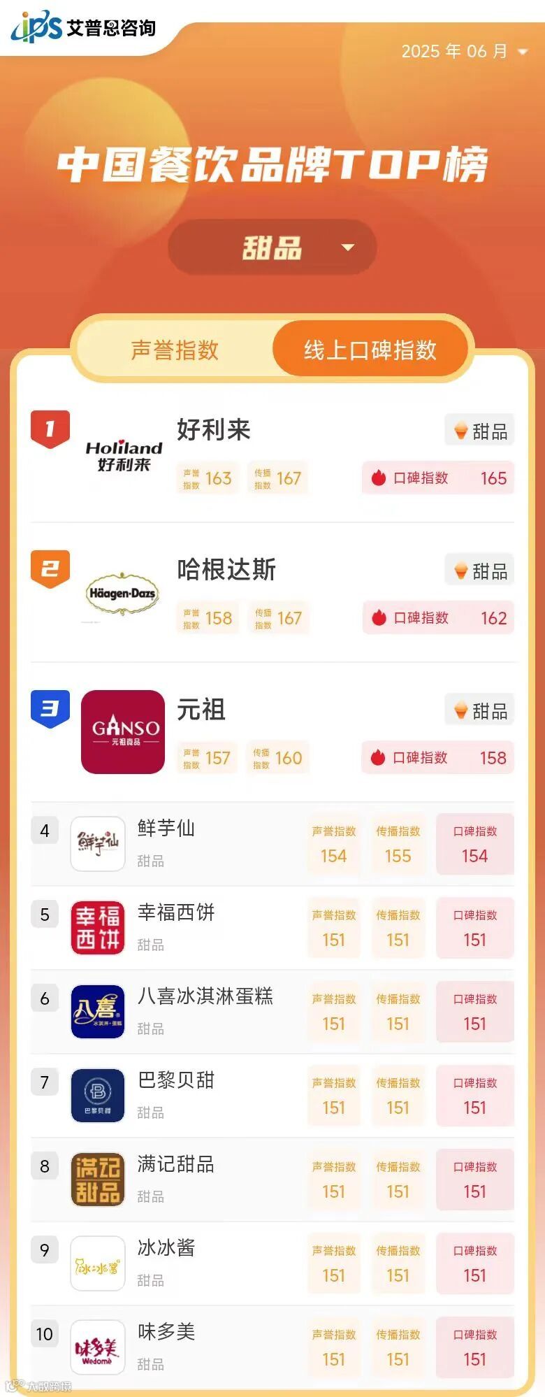 线上口碑指数排名前三的甜品品牌为:好利来、哈根达斯、元祖;线上口碑指数排名前三的饮品品牌为:蜜雪冰城、星巴克、霸王茶姬*;线上口碑指数排名前三的日韩料理品牌为大渔铁板烧、汉拿山、会飞的鸡*;线上口碑指数排名前三的西餐品牌为牛约堡、豪客来、王品牛排*。