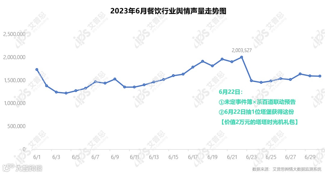艾普思舆情大数据监测系统显示,6月,涉及餐饮行业的舆情声量为46,711,736篇次,较上月有所上升(5月舆情声量为44,754,741篇次),日均声量达1,557,057篇次。从声量走势来看,声量高峰期在6月22日,主要由 “未定事件簿×茶百道联动预告”及“6月22日抽1位塔堡获得这份【价值2万元的塔塔时光机礼包】,希望能带你去往2023的快乐星球”相关信息带动声量。
