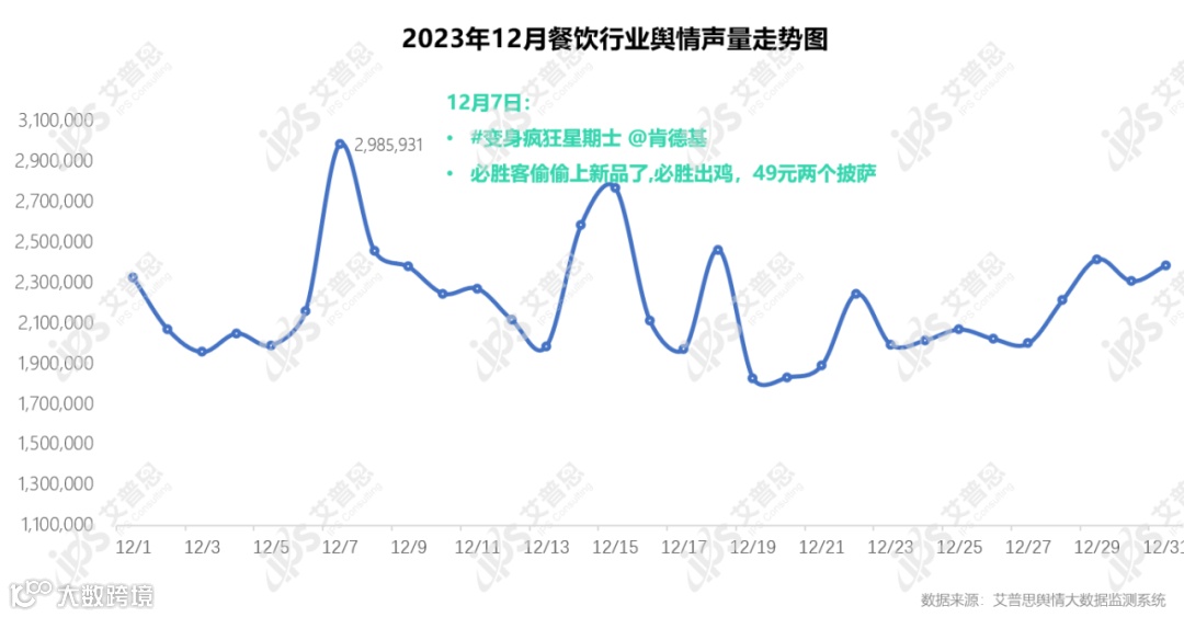 艾普思舆情大数据监测系统显示,12月,涉及餐饮行业的舆情声量为68,118,124篇次,较上月有所上升(11月舆情声量为65,855,644篇次),日均声量达2,197,359篇次。从声量走势来看,声量高峰期在12月7日,主要由“#变身疯狂星期士 @肯德基”和“必胜客偷偷上新品了,必胜出鸡,49元两个披萨”相关报道带动声量。