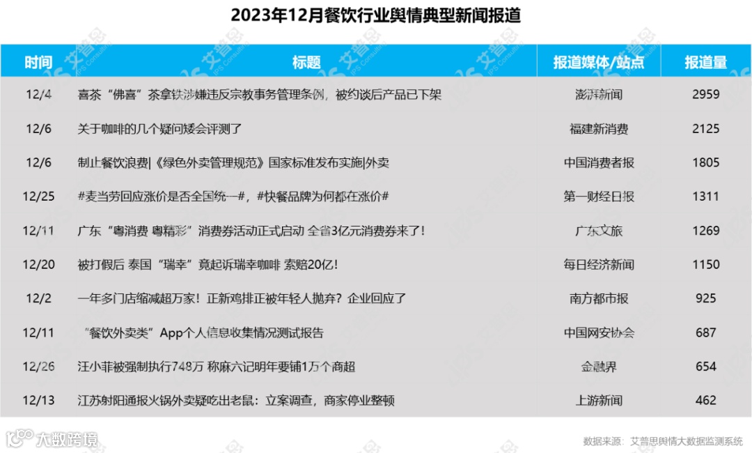 12月,餐饮行业舆情典型报道有《喜茶“佛喜”茶拿铁涉嫌违反宗教事务管理条例,被约谈后产品已下架》、《关于咖啡的几个疑问矮会评测了》、《制止餐饮浪费|《绿色外卖管理规范》国家标准发布实施|外卖》等,报道量排名前十的信息为: