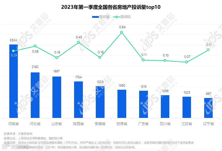 2023年第一季度房地产投诉地域分布:山东省投诉量同比增长逾100%