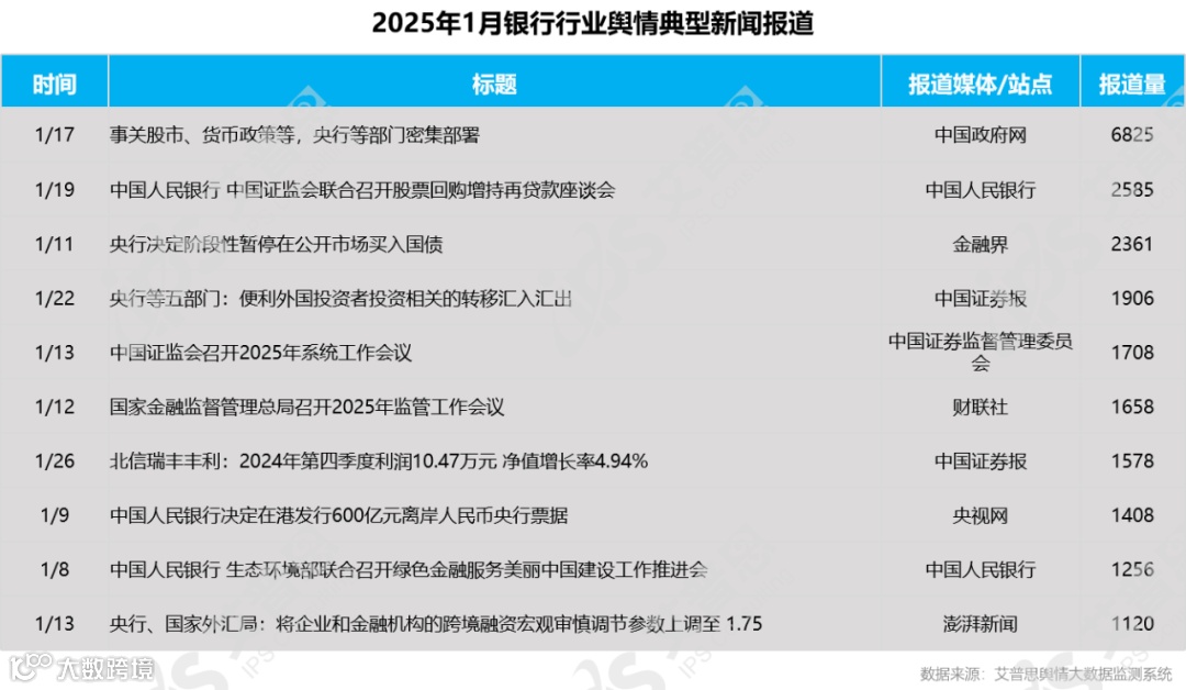 1月,银行业舆情典型报道有《中国人民银行 中国证监会联合召开股票回购增持再贷款座谈会》《央行决定阶段性暂停在公开市场买入国债》《中国证监会召开2025年系统工作会议》《央行等五部门:便利外国投资者投资相关的转移汇入汇出》等,报道量排名前十的信息为: