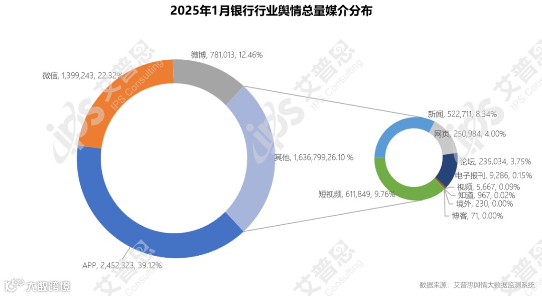 1月,银行业舆情声量来源中,占比最高的媒介为APP,达39.12%,舆情声量为2,452,323篇次;其次为微信,舆情声量达1,399,243篇次,占比22.32%;排名第三的是微博,舆情声量达781,013篇次,占比12.46%;其他媒介中,短视频、新闻、网页等媒介的总占比达26.10%,舆情声量为1,636,799篇次。