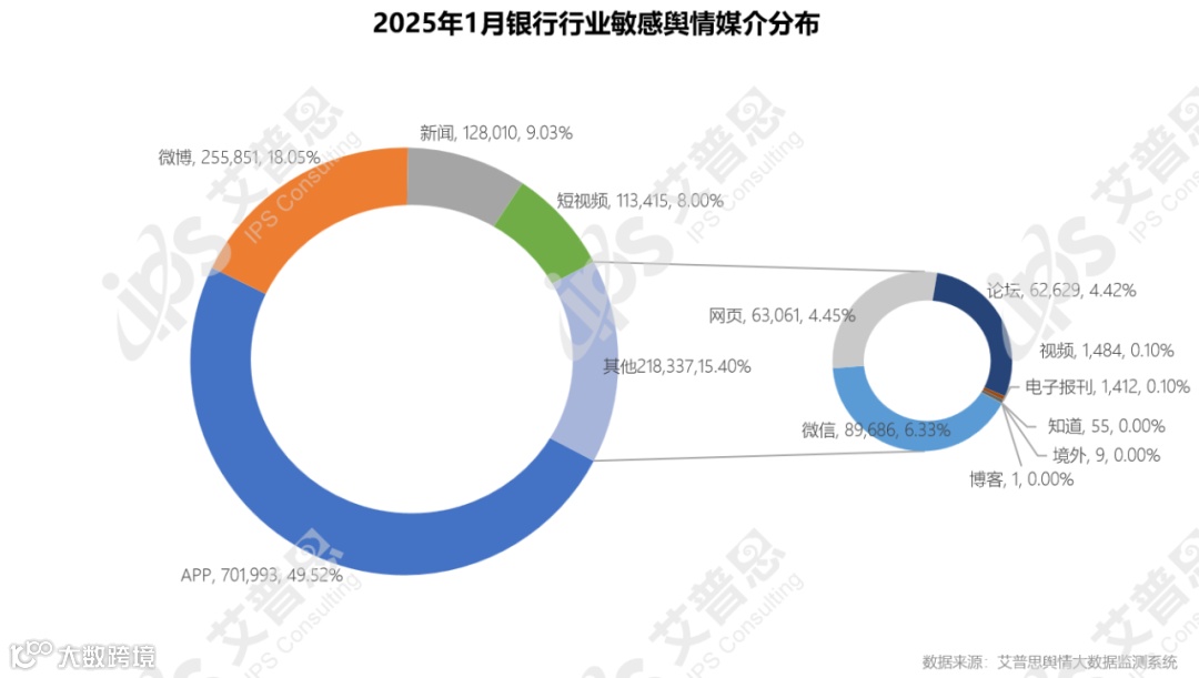 1月,银行业敏感舆情声量来源中,占比最高的媒介为APP,达49.52%,舆情声量为 701,993篇次;其次为微博,舆情声量达255,851篇次,占比18.05%;排名第三的为新闻,舆情声量为128,010篇次,占比9.03%;第四为短视频,舆情声量为113,415篇次,占比8.00%;其他媒介中,微信、网页、论坛等媒介的总占比达15.40%,舆情声量为218,337篇次。