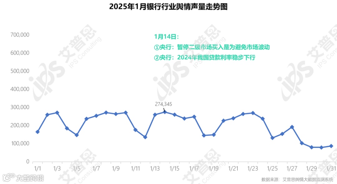 艾普思舆情大数据监测系统显示,1月,涉及银行业的舆情声量为6,269,378篇次,环比下降约14.6%(2024年12月舆情声量为7,336,941篇次),日均声量达202,238篇次。声量高峰主要出现在1月14日(声量274,345篇次),主要受“央行:暂停二级市场买入是为避免市场波动”“央行:2024年我国贷款利率稳步下行”等相关信息影响。