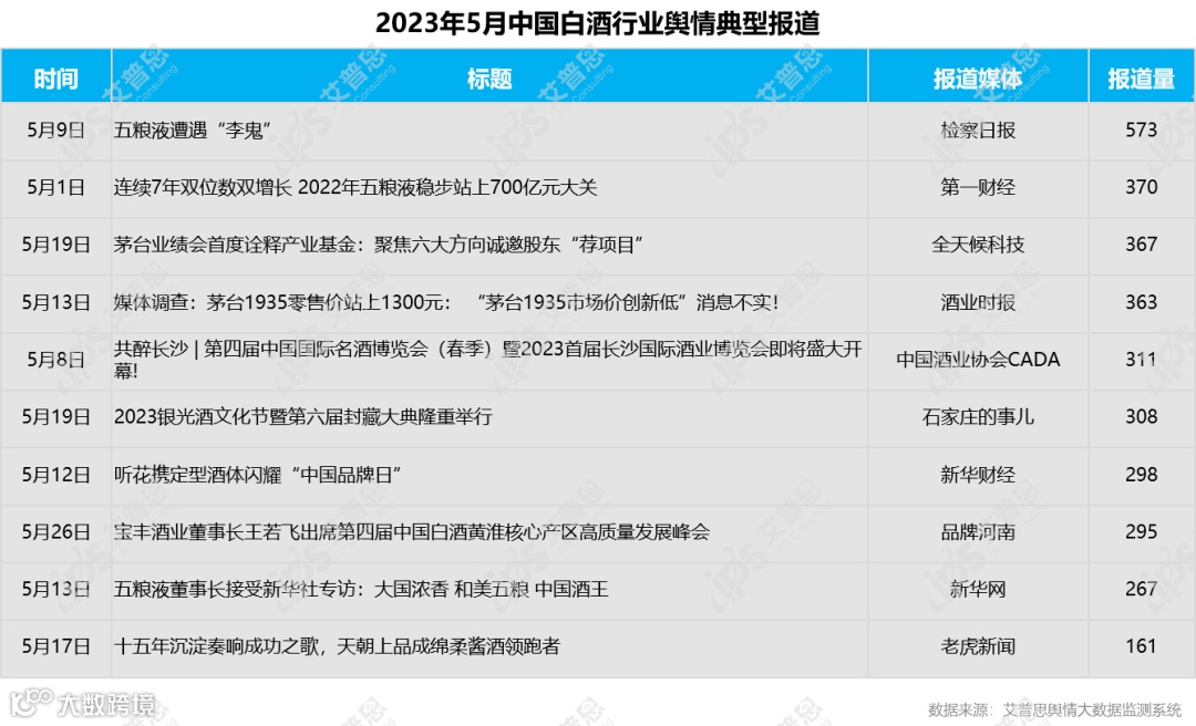 以上内容节选自《艾普思咨询:2023年5月白酒行业舆情监测报告》(全文14页,约3,200字)。