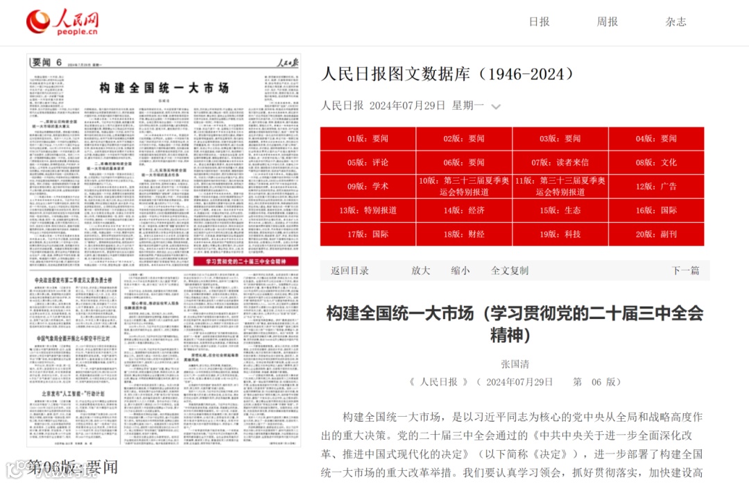 7月29日出版的《人民日报》,刊发了中共中央政治局委员、国务院副总理张国清的署名文章《构建全国统一大市场》,传递出进一步深化改革的多项举措。