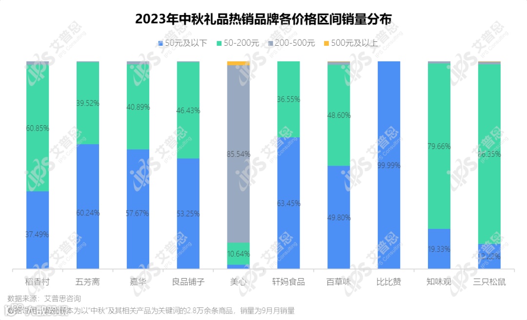 图5:2023年中秋礼品热销品牌各价格区间销量分布