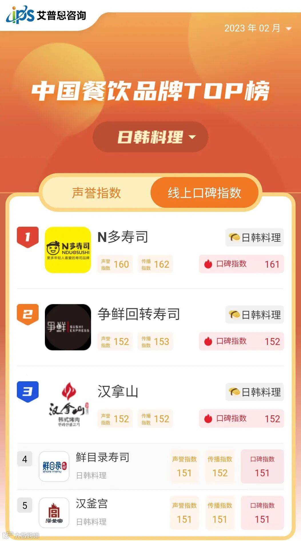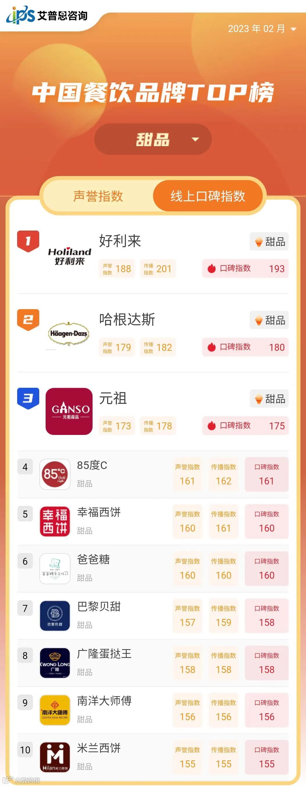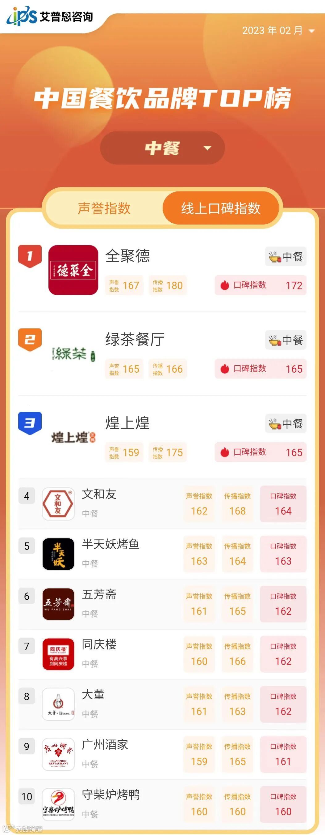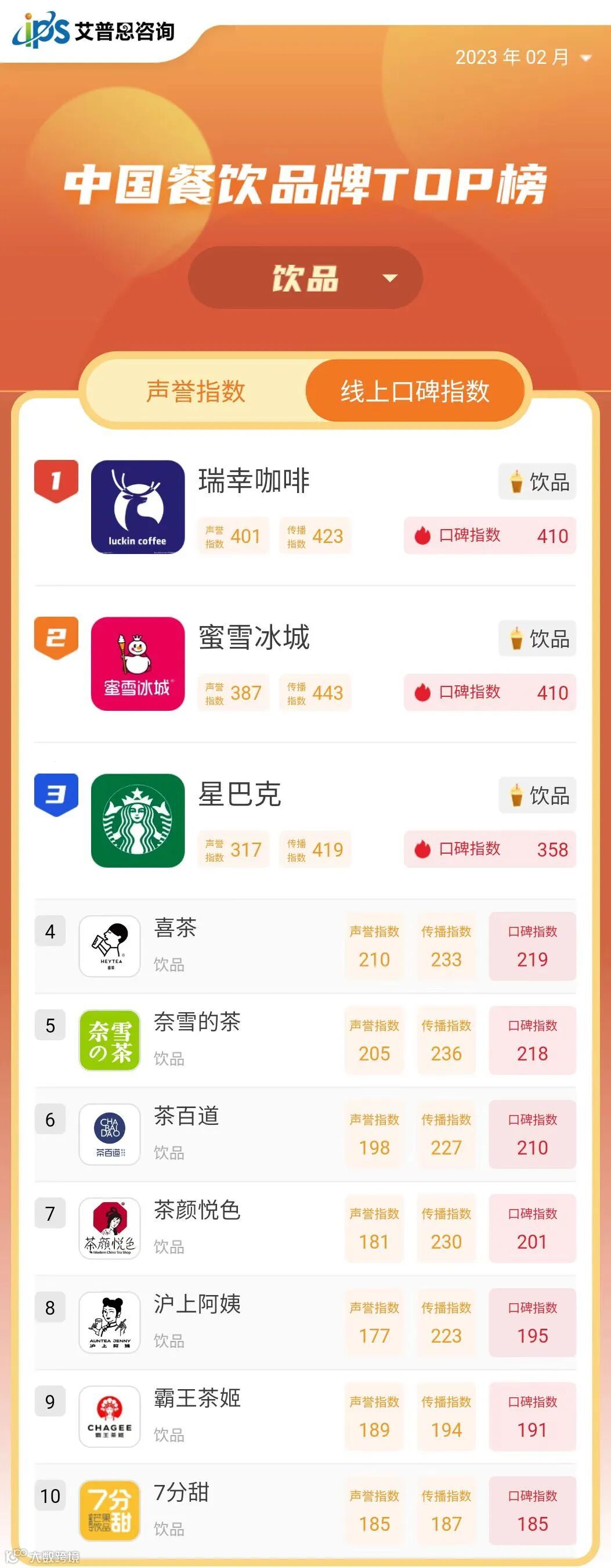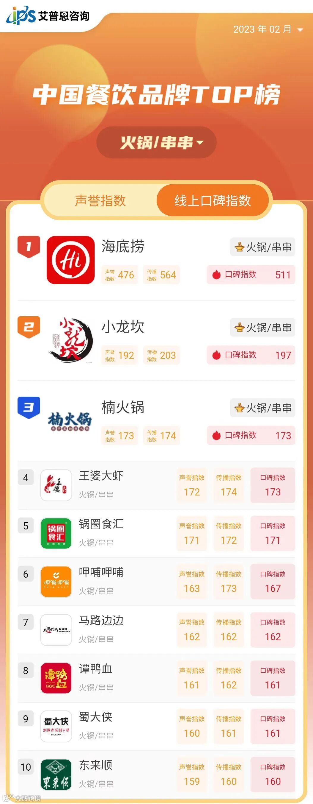 艾普思指数|2023年01月中国餐饮品牌线上口碑指数TOP50
