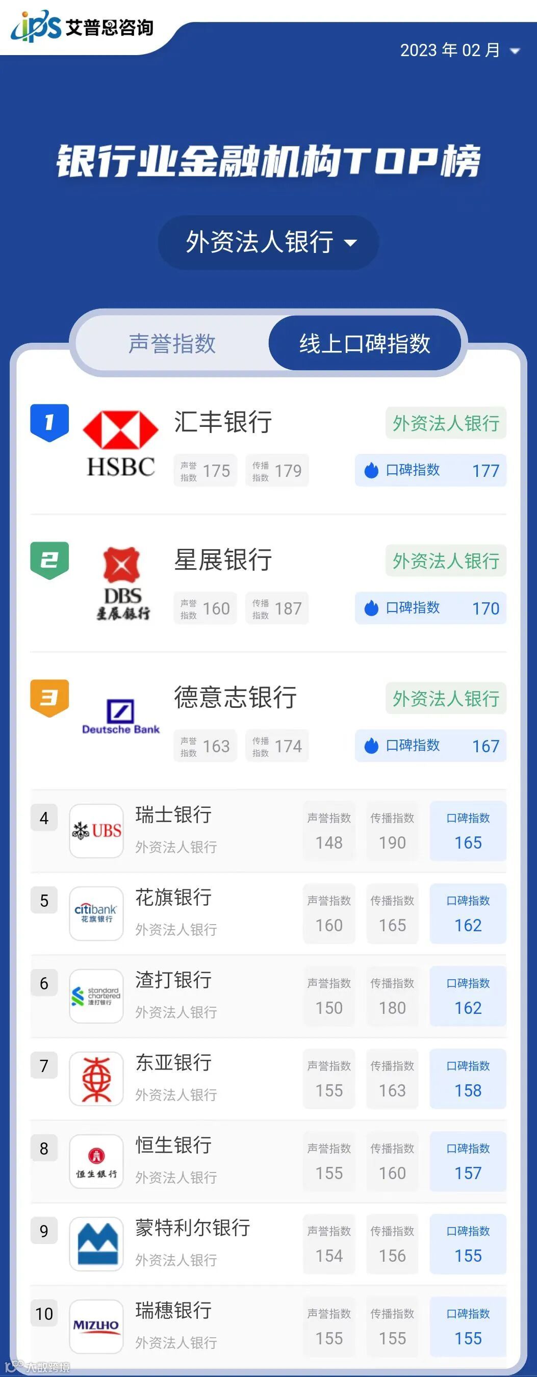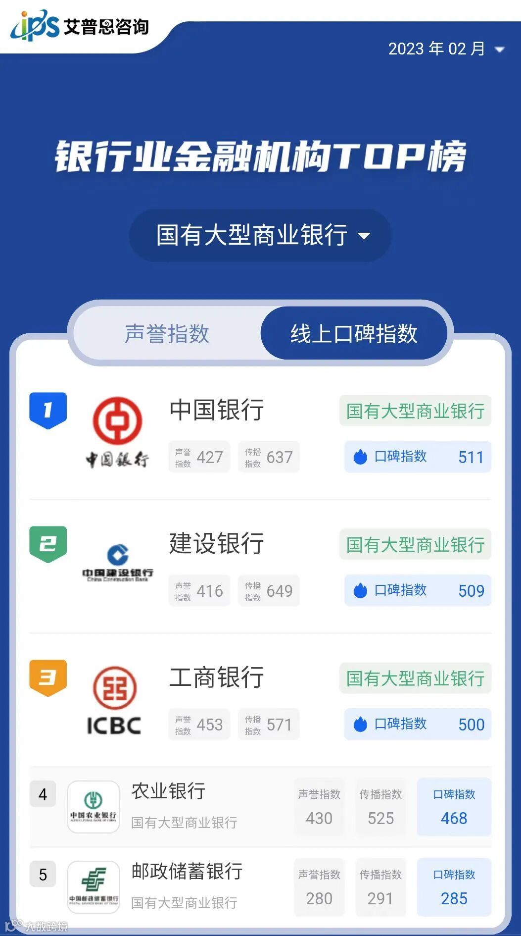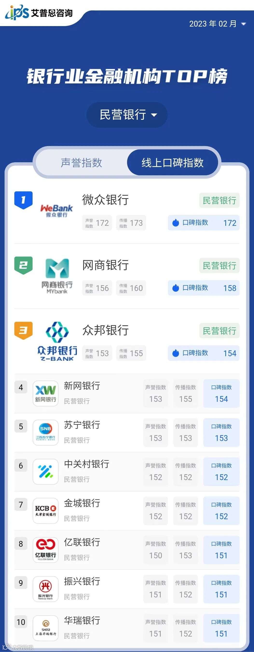 艾普思指数|2023年02月中国银行业金融机构线上口碑指数TOP50