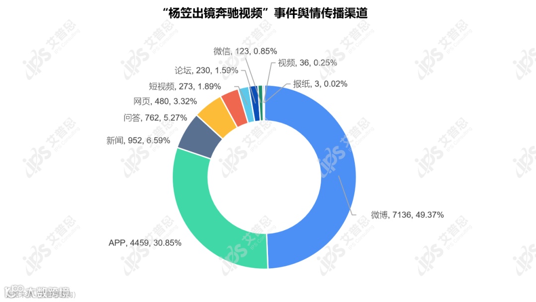 “杨笠出镜奔驰视频”事件相关信息量共计14,454条,其中影响力最大的平台是微博,声量高达7,136条,占总声量的49.37%;其次是APP平台,声量达4,459条,占总声量的30.85%;新闻、问答、网页等平台共计2,859条,占比达19.78%。