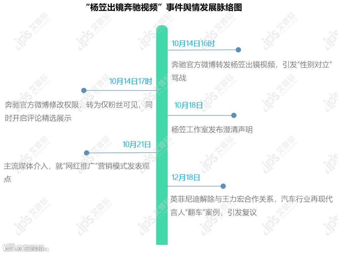 10月18日,微博话题#奔驰 杨笠#登上文娱榜热搜第一,骂战进入大众视线,舆情影响力进一步扩大。当日18时30分,微博认证账号@杨笠工作室 发布声明,称杨笠女士仅受邀为活动拍摄宣传物料,与奔驰并无任何商业合作,亦无车品代言。
