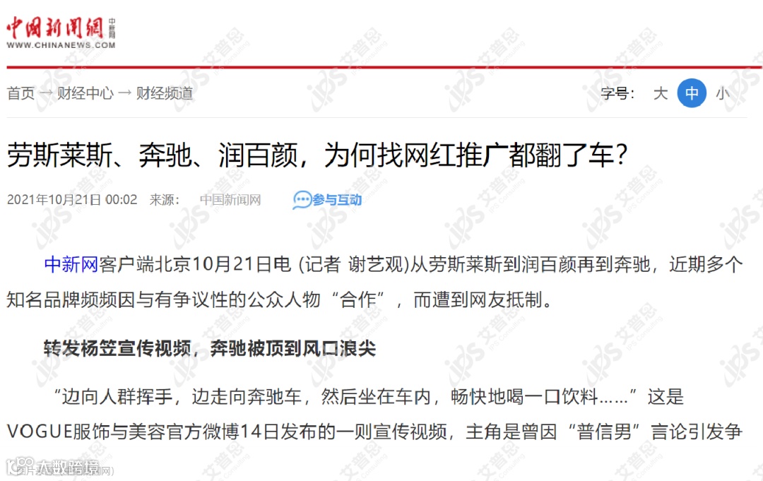 中国新闻网发布以《劳斯莱斯、奔驰、润百颜,为何找网红推广都翻了车?》为题的文章,就近期出现的“网红推广”营销案例进行综合报道,央视网、人民网、中国网等央级媒体相继转发,引发对“网红推广”营销模式的深思。