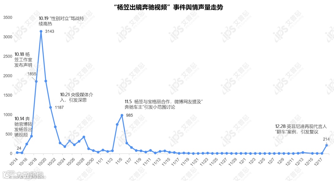 纵观“杨笠出镜奔驰视频”事件的舆情发展周期,前后出现了三次声量高峰:10月14日16时许奔驰官博@梅赛德斯-奔驰 转发宣传视频,引发骂战;18日,微博话题#奔驰杨笠视频引争议#登上微博热搜榜,舆情声量持续上升,于19日达到峰值(当日声量达3,143条);11月5日,杨笠与宝格丽合作,微博网友提及“奔驰车主”引发小范围讨论;12月18日,英菲尼迪再现代言人“翻车”案例,引发复议。