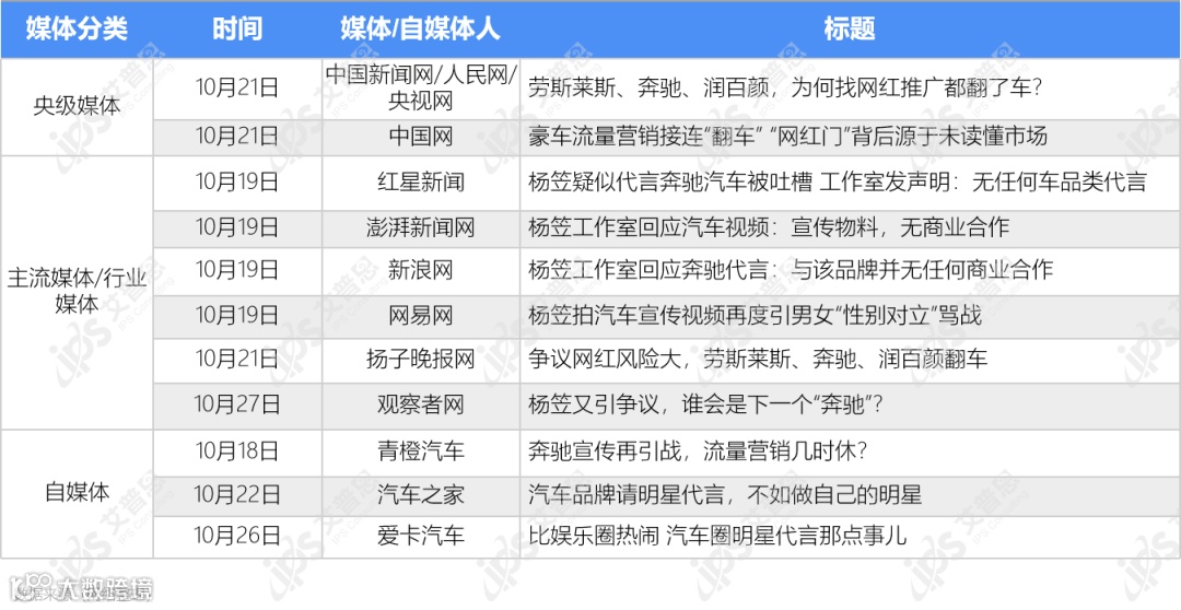 媒体除客观报道事件外,其他评论观点集中在品牌营销不能“唯流量论”、“明星代言”亦或“网红推广”有风险等方面,部分媒体援引“劳斯莱斯事件”,对奔驰此次做法持“唱衰”之态。