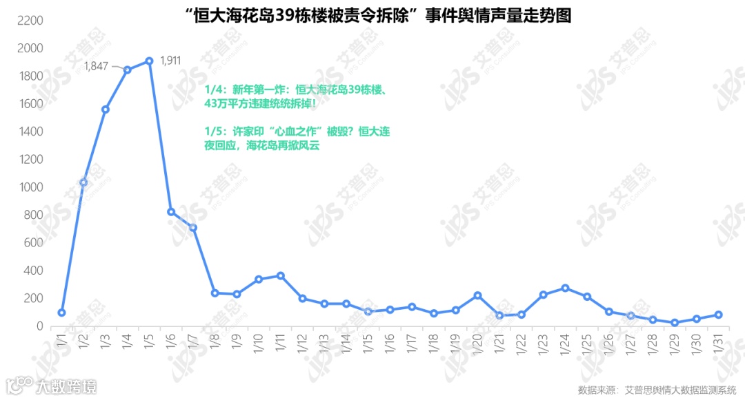 艾普思舆情大数据监测系统显示,“恒大海花岛39栋楼被责令拆除”事件舆情声量为11,775篇次,声量峰值出现在1月5日(单日声量1,911篇次),随后舆情声量迅速回落,至1月29日降至27篇次。
