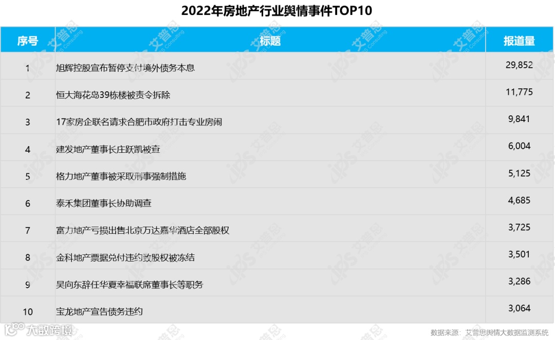 艾普思舆情大数据监测系统显示,2022年热度排名前十的房地产行业舆情事件包括:“旭辉控股宣布暂停支付境外债务本息”、“恒大海花岛39栋楼被责令拆除”、“17家房企联名请求合肥市政府打击专业房闹”、“建发地产董事长庄跃凯被查”等,涉及旭辉、恒大、建发、格力等品牌,2022年房地产行业舆情事件排名前十的如下: