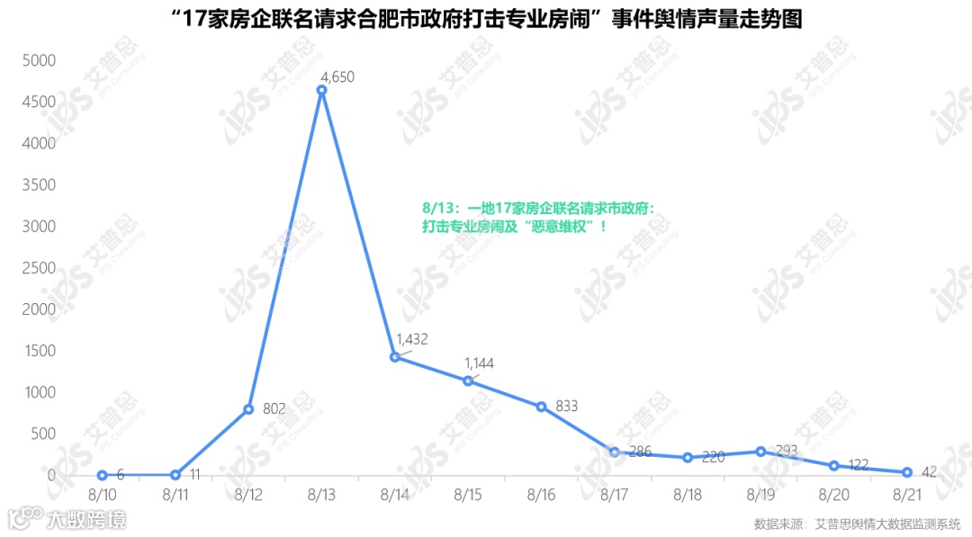 艾普思舆情大数据监测系统显示,“17家房企联名请求合肥市政府打击专业房闹”事件舆情声量为9,841篇次,声量峰值出现在8月13日(单日声量4,650篇次);舆情声量在8月12日文件流传之后急剧上升,随后迅速回落。