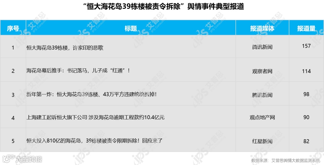 关于“恒大海花岛39栋楼被责令拆除”舆情事件的典型报道包括《恒大海花岛39栋楼,许家印的悲歌》《新年第一炸:恒大海花岛39栋楼、43万平方违建统统拆掉!》《上海建工起诉恒大旗下公司 涉及海花岛逾期工程款约10.4亿元》等,报道量排名前五的信息为: