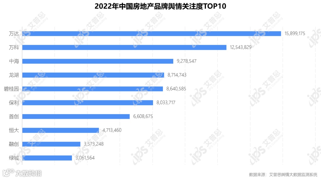 艾普思舆情大数据监测系统显示,2022年,舆情关注度排名第一的房地产品牌为万达,舆情声量达15,899,175篇次;其次为万科,舆情声量达12,543,829篇次;关注度排名第三的为中海,舆情声量达9,278,547篇次。2022年舆情关注度排名前十的房地产品牌如下: