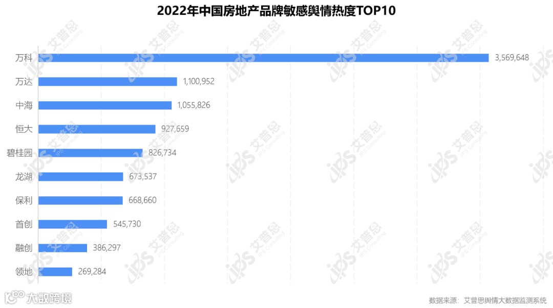 艾普思舆情大数据监测系统显示,2022年,敏感舆情热度排名第一的房地产品牌为万科,敏感舆情声量达3,569,648篇次;其次为万达,敏感舆情声量达1,100,952篇次;敏感舆情热度排名第三的为中海,敏感舆情声量达1,055,862篇次。2022年敏感舆情热度排名前十的房地产品牌如下: