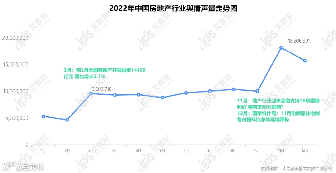 艾普思舆情大数据监测系统显示,2022年,涉及房地产行业的舆情声量为121,577,510篇次,日均声量达333,089篇次。其中,声量极值出现在11月(当月声量18,206,391篇次),主要受《地产行业迎来金融支持16条重磅利好 将带来哪些影响?》《政经谭 |“第三支箭”落地 证监会恢复房企再融资及允许重组上市》等报道的影响。