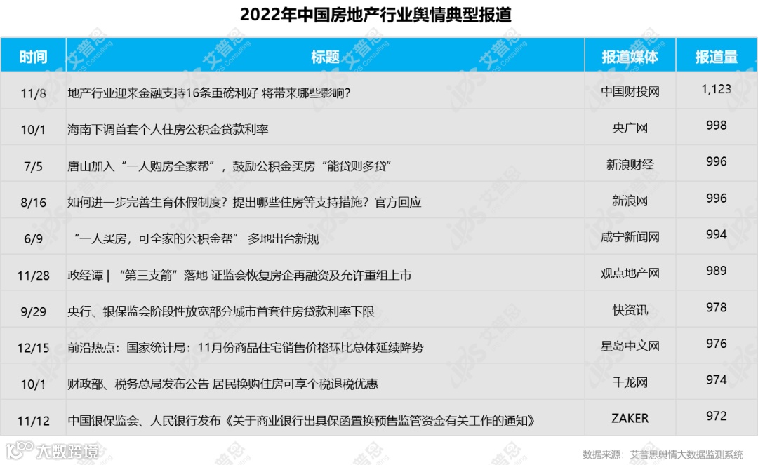 2022年,房地产行业舆情典型报道有《地产行业迎来金融支持16条重磅利好 将带来哪些影响?》《政经谭|“第三支箭”落地 证监会恢复房企再融资及允许重组上市》《中国银保监会、人民银行发布<关于商业银行出具保函置换预售监管资金有关工作的通知>》《两部门召集银行座谈:稳定开发贷投放,支持住房贷款合理需求》等,报道量排名前十的信息为: