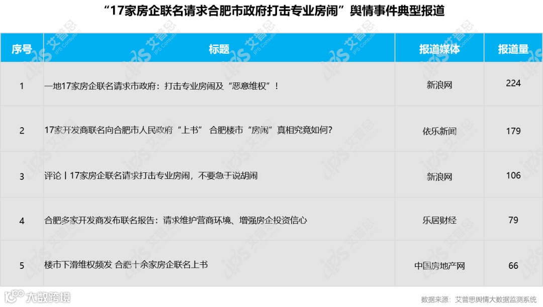 关于“17家房企联名请求合肥市政府打击专业房闹”舆情事件的包括《一地17家房企联名请求市政府:打击专业房闹及“恶意维权”!》《17家开发商联名向合肥市人民政府“上书” 合肥楼市“房闹”真相究竟如何?》《评论丨17家房企联名请求打击专业房闹,不要急于说胡闹》等,报道量排名前五的信息为: