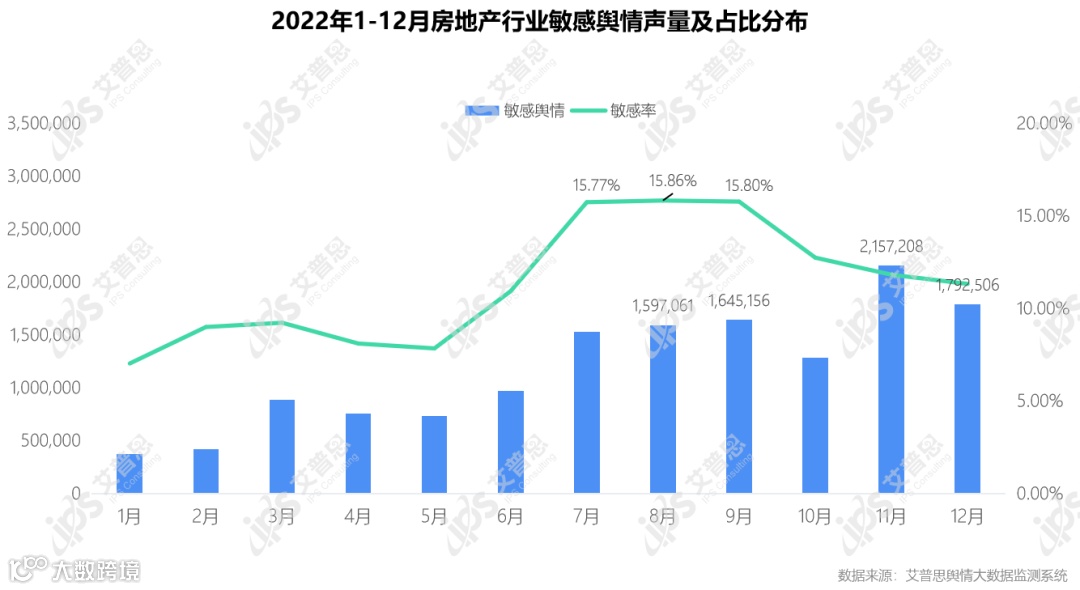 图3:2022年1-12月房地产行业敏感舆情声量及占比分布