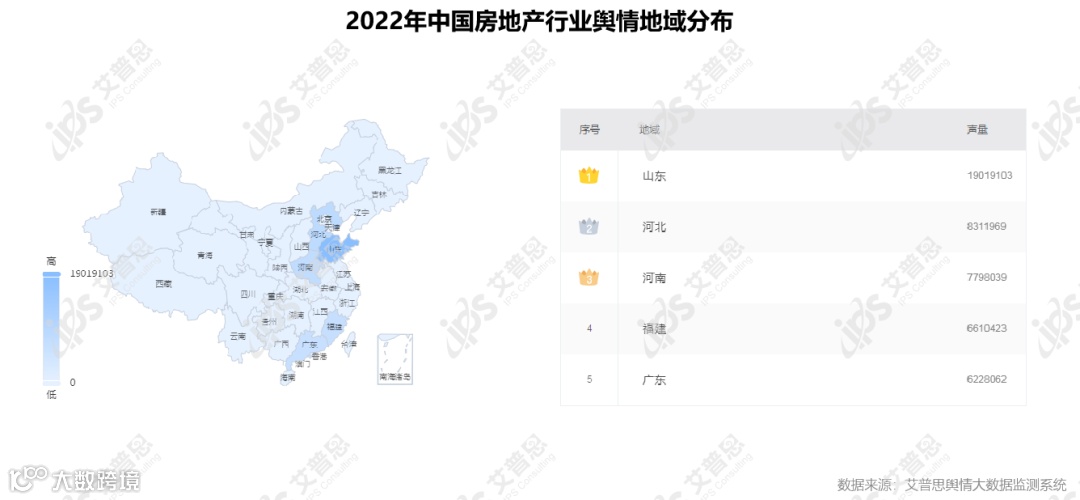 2022年,房地产行业舆情涉及山东、河北、河南等31个省市。其中,排名第一的为山东省,舆情声量达19,019,103篇次;排名第二的为河北省,舆情声量达8,311,969篇次;排名第三的为河南省,舆情声量达7,798,039篇次。31省市舆情声量分布情况如下: