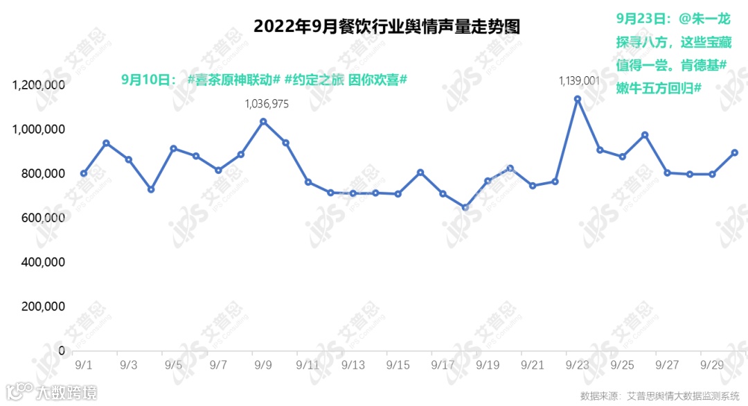 艾普思舆情大数据监测系统显示,9月,涉及餐饮行业的舆情声量为24,894,177篇次,较上月有小幅度下降(27,816,393篇次),日均声量达897,303篇次。从声量走势来看,9月餐饮行业舆情态势整体波动较大,出现两个极值,主要由话题“喜茶原神联名”、“朱一龙代言肯德基”带动声量。