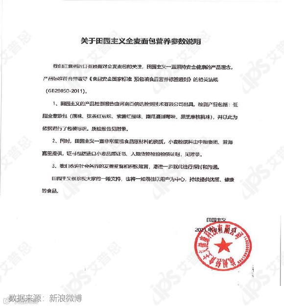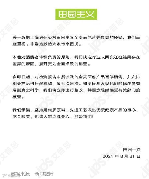 8/31晚:田园主义再回应全麦面包低标能量:暂停销售并安排复检