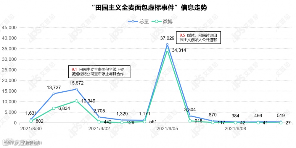 从舆情走势来看,前期爆发点在9月1日,当日涉事面包全线下架,薇娅宣布停止与其合作。声量峰值出现在9月5日,当日田园主义创始人公开道歉视频于全网传播。