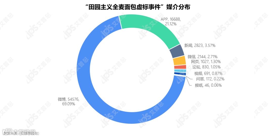 数据监测期间,“田园主义全麦面包虚标事件”相关舆情声量共计78,997条,日均6,583条,主要传播渠道为微博,声量达54,576条,占比近七成。