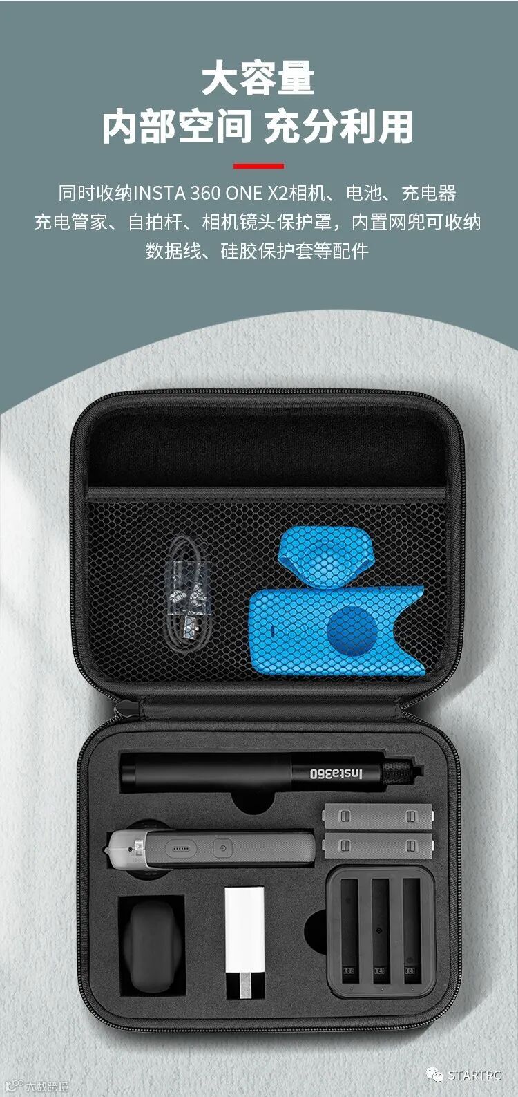 体积小但容量大,可同时收纳INSTA360 ONE X2,电池以及自拍杆(70CM),充电器,数据线等细小配件