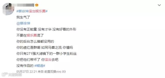 例如同样备受争议的蔡徐坤,因为长相气质不好,才华不足,没有正能量,被要求滚出娱乐圈。
