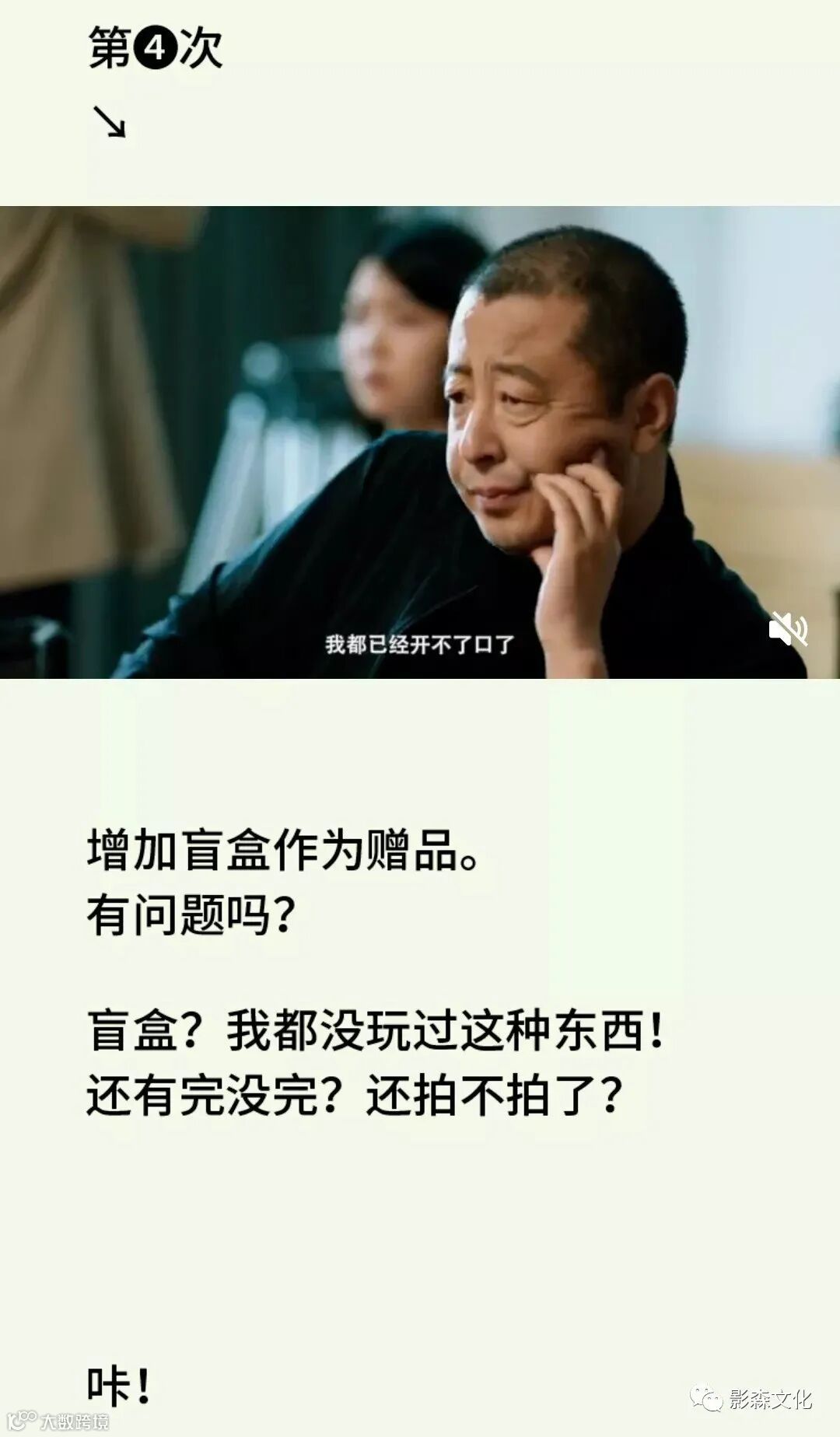 在两分多钟的视频里,场记板上的镜次从五次改到八次,最后记录的笔直接改到没水。贾导的各种细节也让人忍俊不禁,不停转动的水杯,以及想发飙时却只能忍住飙出的英文:“I see、I see”,果然不会演戏的导演不是好导演,贾导把乙方无奈的表情和气质拿捏得死死的。