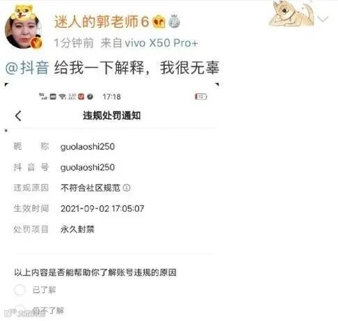 9月2日,郭老师在发博晒出被抖音永久封禁的截图,配文“给我一下解释,我很无辜”。