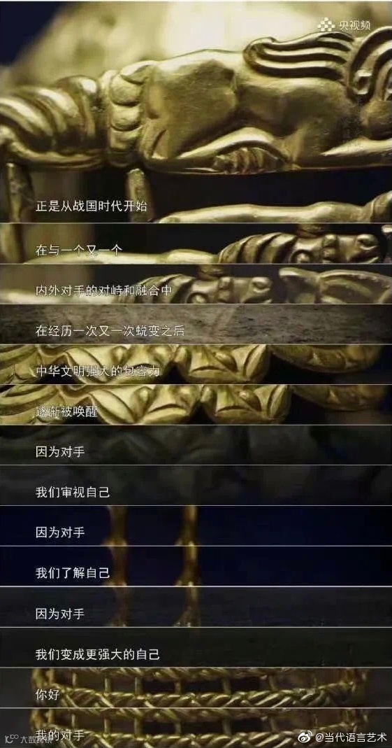 13 正是从战国时代开始,在与一个又一个内外对手的对峙和融合中,在经历一次又一次蜕变后,中华民族强大的包容力,逐渐被唤醒,因为对手我们审视自己,因为对手我们了解自己,因为对手,我们变成更强大的自己,你好我的对手。