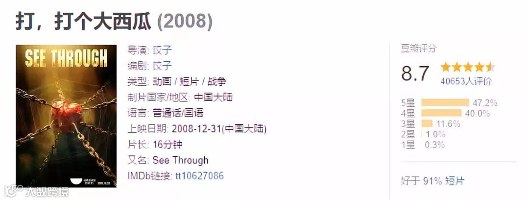 导演饺子也有口碑和知名度,他所执导的《打,打个大西瓜》动画短片目前在豆瓣是8.6分。
