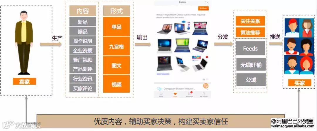 不仅仅是自己已有的潜在买家能够看到,还会通过关注关系,算法推荐,推送到买家获得买家关注,优质的内容会有推送到公域的奖励,如无线APP开屏、首页焦点图、预搜索 Banner、搜索1号位 Banner 和搜索2号位 Banner;