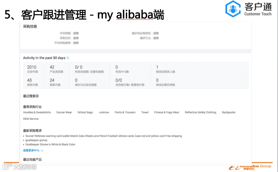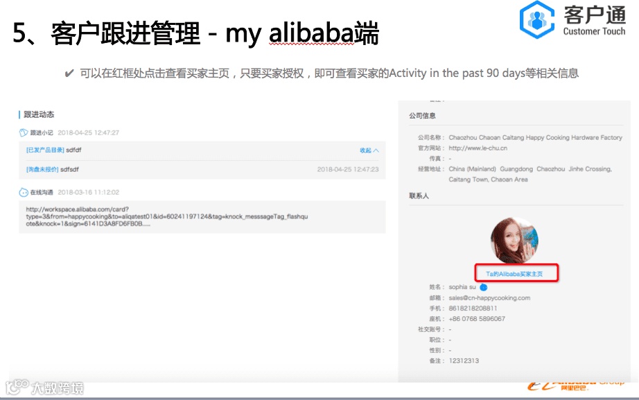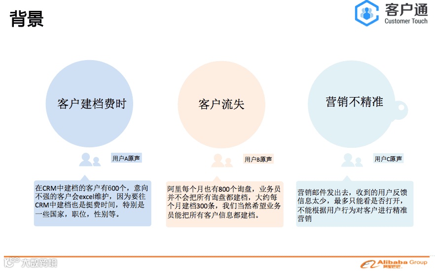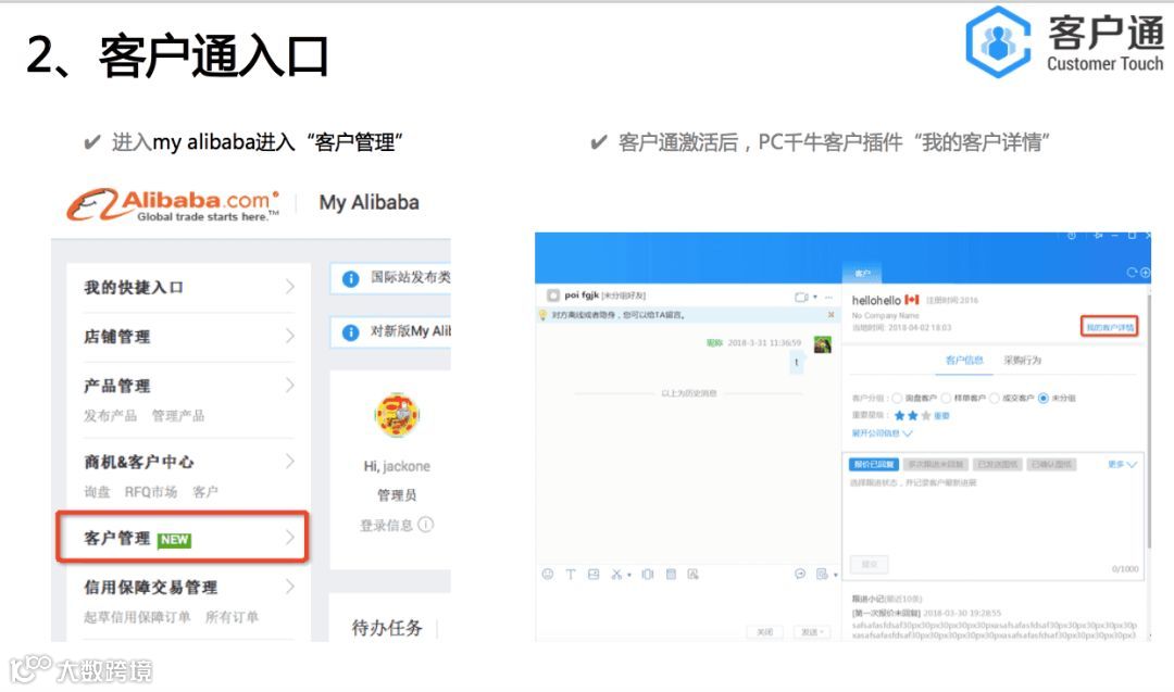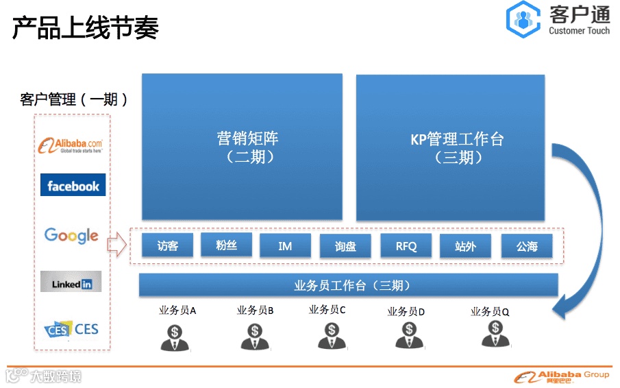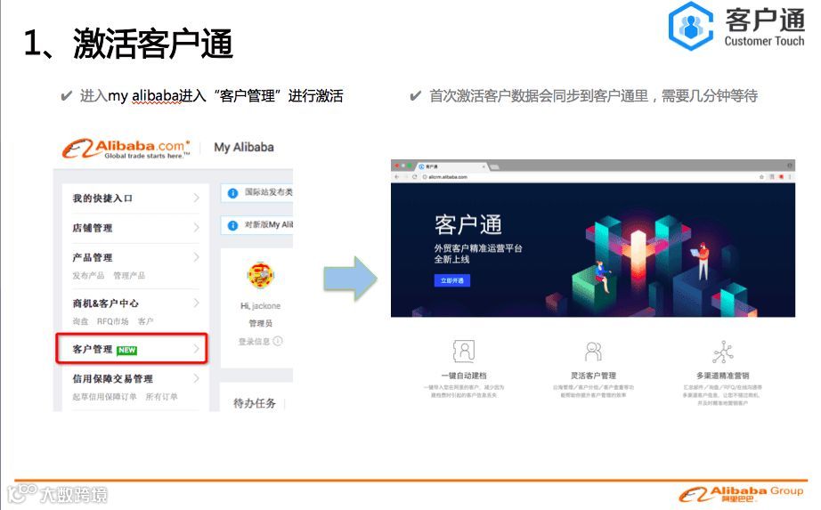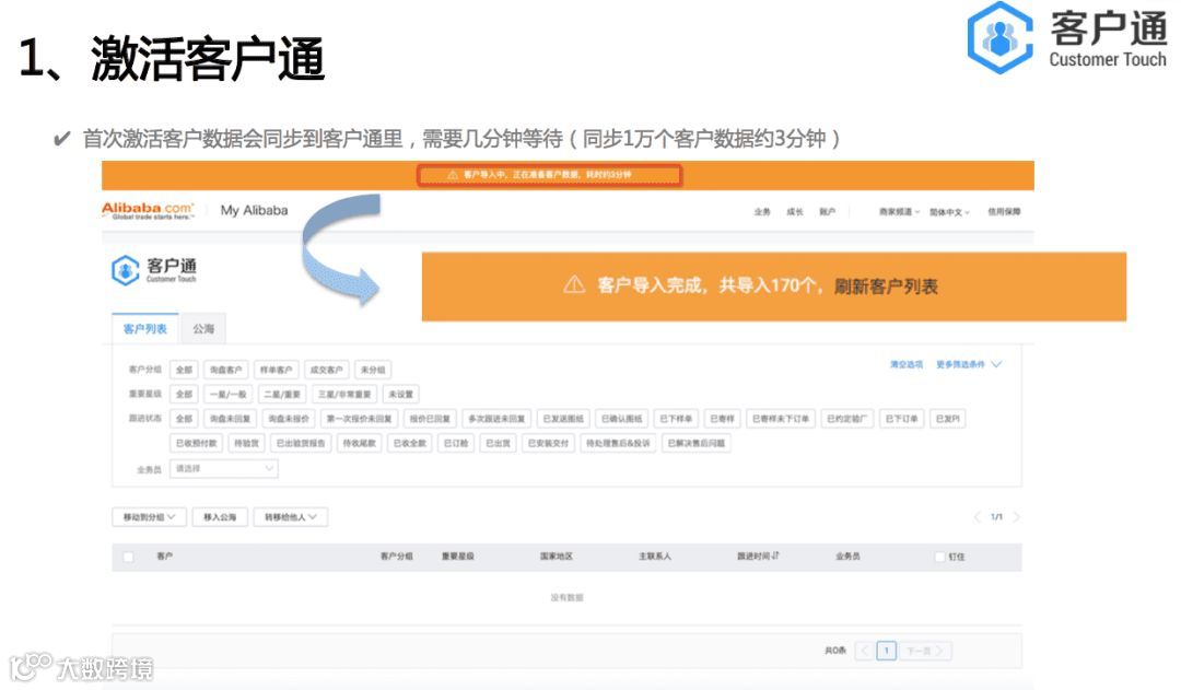 客户通的服务器是独立部署,是独立于alibaba网站 。点击开通客户通后,会从阿里巴巴把数据导入到客户通里面,是单向导入,数据没有互通。客户通的目的是帮助商家做好自己的客户生命周期管理,通过精细化的运营自己的客户,缩短客户转化周期和提升客户转化率,从而实现业绩增长。所以我们的视角是帮助每一个商家针对他们自己的客户群体。