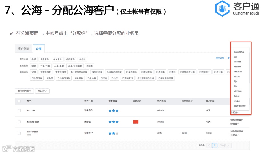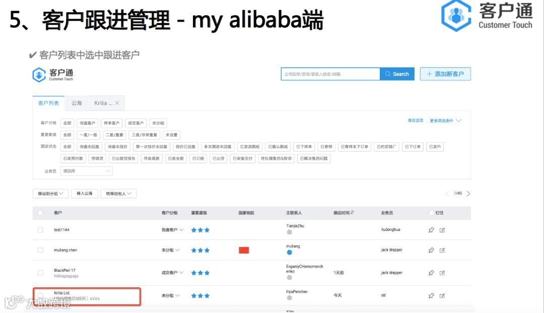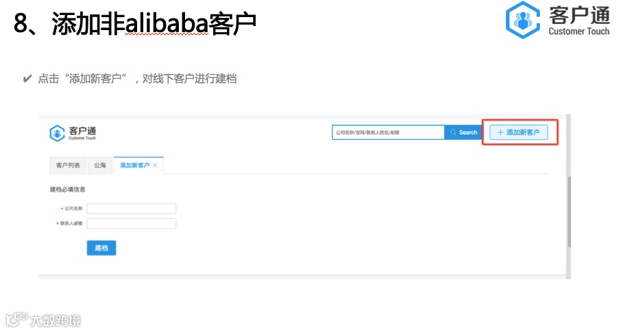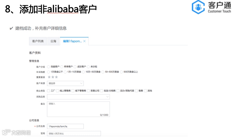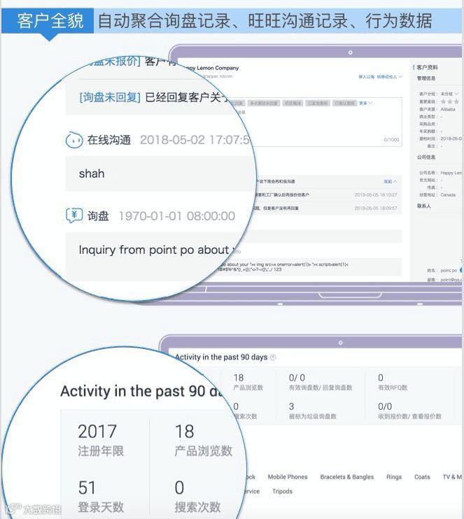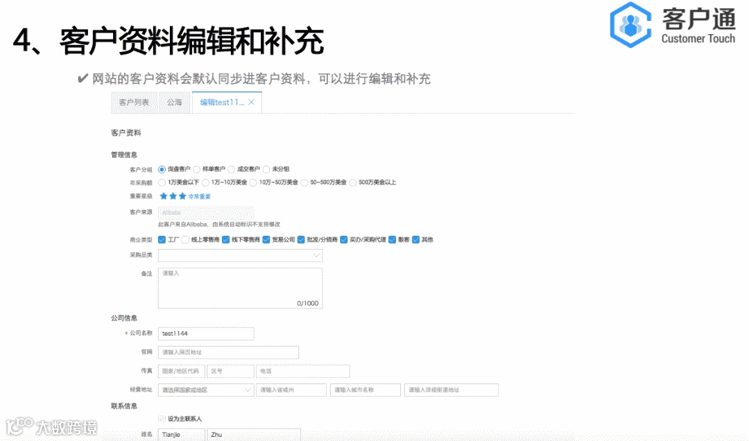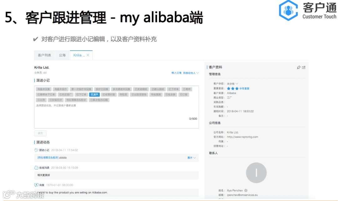 客户通的服务器是独立部署,是独立于alibaba网站 。点击开通客户通后,会从阿里巴巴把数据导入到客户通里面,是单向导入,数据没有互通。客户通的目的是帮助商家做好自己的客户生命周期管理,通过精细化的运营自己的客户,缩短客户转化周期和提升客户转化率,从而实现业绩增长。所以我们的视角是帮助每一个商家针对他们自己的客户群体。