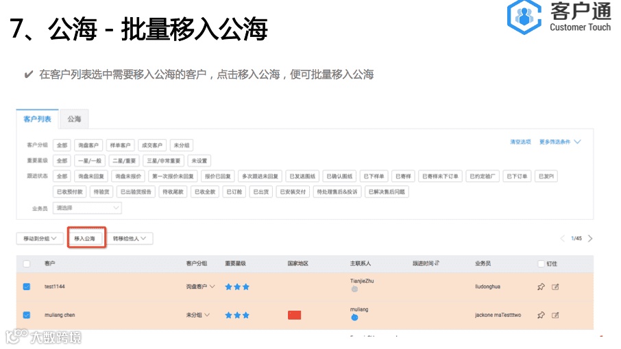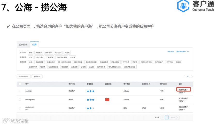 为避免因业务员忘记操作“加为我的客户”而导致他的客户流入公海,在开启公海前,请务必通知各业务员去“询盘列表”将自己的客户完成“加为我的客户”操作。