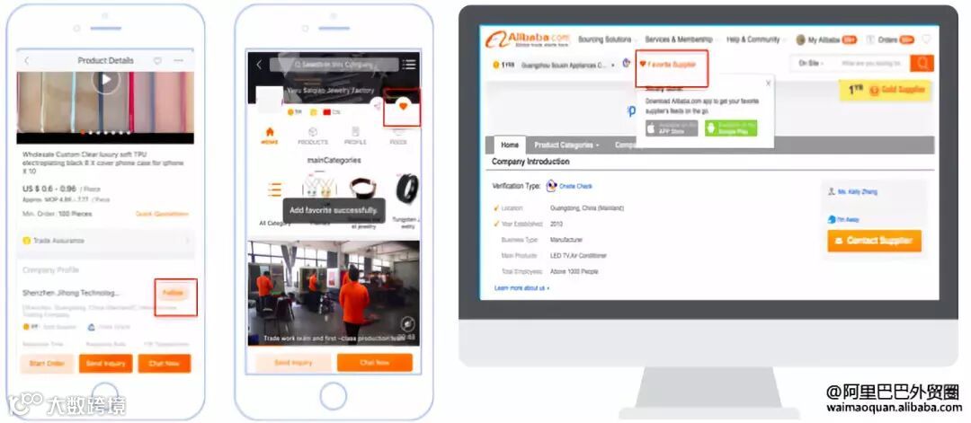 2)无线端:买家进入到卖家无线旺铺→点击右上角”❤️“(Favorite)按钮,即形成关注关系;