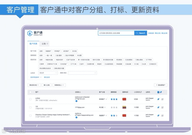 客户通是阿里巴巴官方出品,专注于帮助商家提升客户管理和运营效能的平台 ,是针对出口通的会员的免费增值功能,包括客户分组管理,客户潜力分,客户精准营销等功能。根据客户画像大数据,基于alibaba网站客户触达渠道,通过精准匹配,帮助商家提升客户运营的效能。