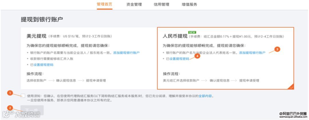 1)操作路径:卖家到“MA后台-信用保障服务管理中心-管理首页-其他出口可提-选择提现方式”中设置支付/提现密码(只有主账号可设置该密码);