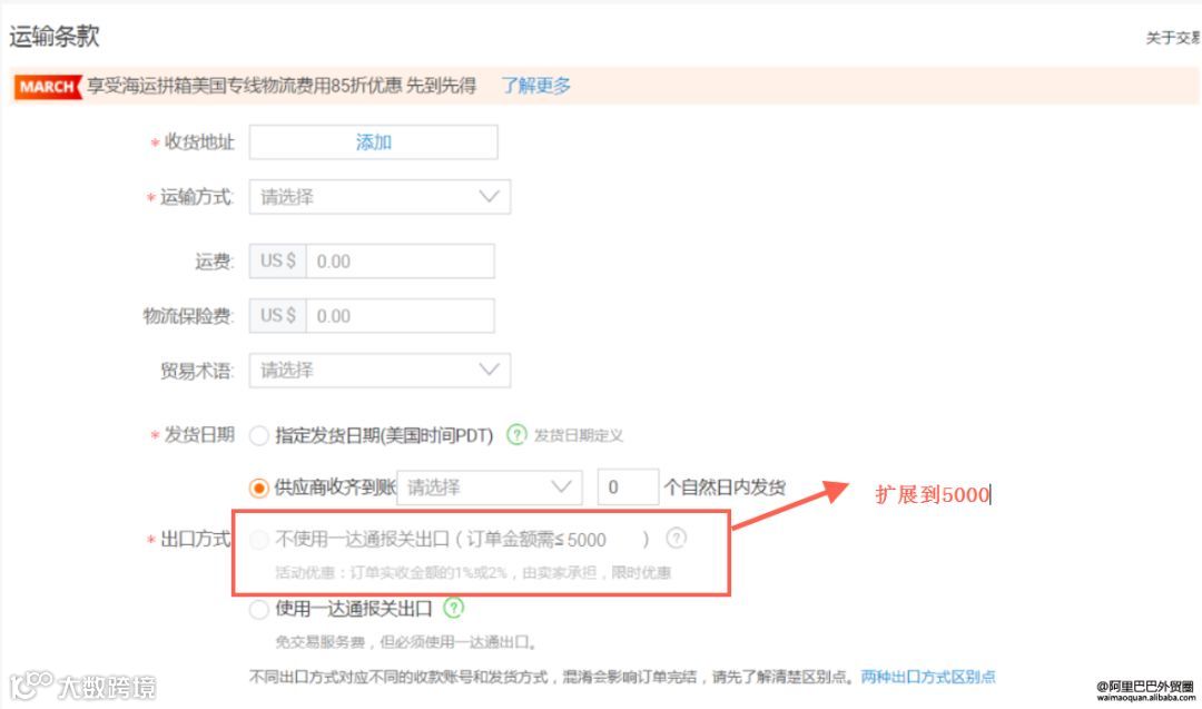 这就意味着:所有5000美金以下的信用保障订单,都可以自主选择是否通过一达通报关出口,同样可累积网站信用及网站权益;