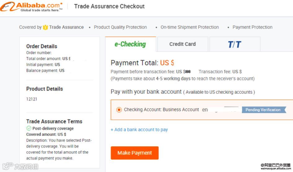 3)买家首次使用E-checking支付需完成银行账户认证,点击查看认证方式